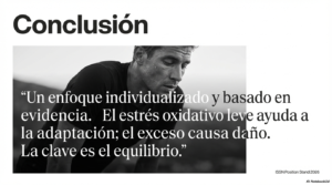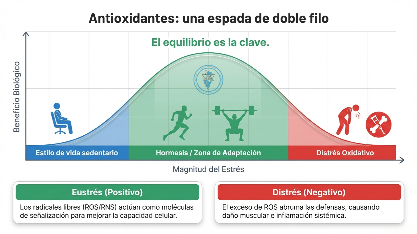 - Por un lado, está el eustrés oxidativo, que es un nivel leve de estrés absolutamente esencial para la señalización celular y para promover adaptaciones favorables en la salud y el rendimiento.