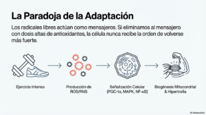 Cuando el ejercicio induce un nivel moderado de radicales libres, estos actúan como señales para favorecer la contracción muscular y la hipertrofia. En cambio, cuando el cuerpo se somete a un sobreentrenamiento o a una recuperación inadecuada, el exceso de estrés oxidativo genera fatiga severa, inflamación, daño muscular y supresión del sistema inmunológico.