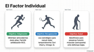 La respuesta a los antioxidantes varía drásticamente dependiendo de factores individuales como el sexo, la edad y las demandas laborales. Las mujeres, por ejemplo, poseen niveles de estrógeno que exhiben propiedades antioxidantes intrínsecas, lo que significa que sus cuerpos regulan el estrés oxidativo de forma diferente a los hombres y podrían experimentar respuestas distintas a los suplementos. Por otro lado, los atletas de categoría máster o adultos mayores enfrentan una producción incrementada de radicales libres como parte del proceso natural de envejecimiento, por lo que estrategias dietéticas que incluyan polifenoles y ácidos grasos omega tres pueden ser especialmente útiles para mantener su salud metabólica y su fuerza muscular. Del mismo modo, los atletas tácticos como bomberos o militares, quienes sufren de inflamación crónica por falta de sueño y ambientes extremos, también podrían encontrar gran valor en terapias antioxidantes bien estructuradas.