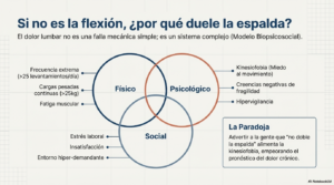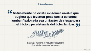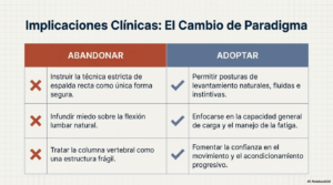 Por lo tanto, persistir en el consejo clínico y ocupacional de evitar la flexión lumbar no solo carece de respaldo biomecánico in vivo, sino que puede ser contraproducente. Fomentar la idea de que la espalda es vulnerable si se dobla puede generar ansiedad y patrones de movimiento rígidos y poco naturales que, paradójicamente, podrían perpetuar las molestias.