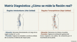 Los de mayor calidad utilizaron sensores «intralumbares» (un estándar de oro en biomecánica que mide específicamente los segmentos de la columna baja), mientras que otros utilizaron ángulos «toracopélvicos» (marcadores en la espalda alta y la pelvis, que son menos precisos).