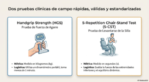- La prueba de levantarse de la silla (5 Repetition chair Stand test): mide el rendimiento al levantarse y sentarse de una silla 5 veces consecutivas.