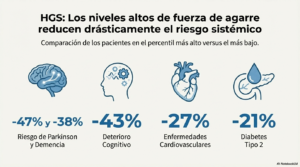 Además, el estudio encontró que incluso las pequeñas mejoras importan: por cada incremento de 5 kilos en la fuerza de agarre, se reduce el riesgo de desarrollar la mayoría de estas enfermedades.