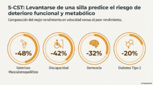 Por otro lado, la prueba de levantarse de la silla 5 veces demostró ser un excelente indicador, especialmente del funcionamiento de las extremidades inferiores y la movilidad. Los adultos que lograron los mejores tiempos al realizar esta prueba mostraron un menor riesgo de desarrollar diabetes tipo 2, problemas musculoesqueléticos, discapacidad, depresión y demencia.